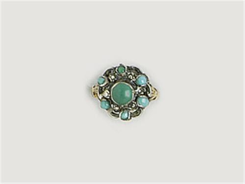 Silver and gold, rosette form head with turquoise decoration, circa 1930, unmarked, diameter: 19.5 mm, weight: 5.3 g, worn shank.