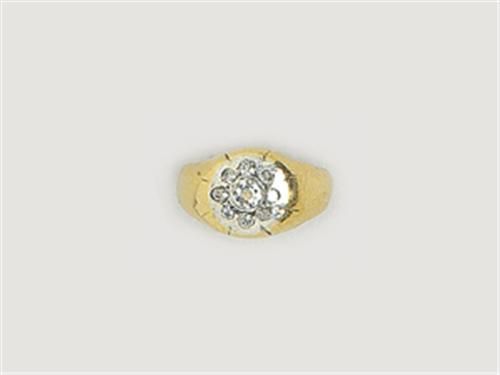 14 K gold, caul type, 1 bigger and 8 tiny brilliants cca. 0.30 ct (R2CrP1) in the head, circa 1930, marked, diameter: 18.2 mm, weight: 7.9 g, in good condition.