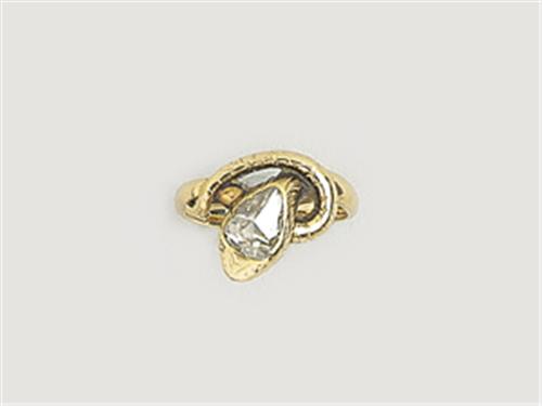 14 K gold, snake form, 1 closed set drop shape diamond cca. 0.80 ct, circa 1900, marked, diameter: 18.3 mm, weight: 6.1 g, in good condition.