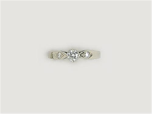14 K white gold, 1 claw set bigger and 2 smaller brilliants on the ring shoulder together 0.45 ct (MTCrP1), marked, diameter: 18.3 mm, weight: 4.2 g, in excellent condition.