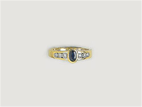 18 K gold, 1 oval form real sapphire and 6 brilliants cca. 0.30 ct (MTCrVs), marked, diameter: 17.5 mm, weight: 4.6 g, in good condition.