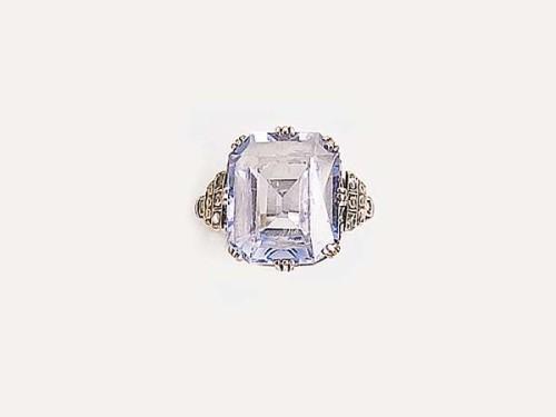 14 K white gold, 1 big blue claw set synthetic stone and 6 tiny brilliants cca. 0.10 ct (ACrSi), circa 1930, unmarked, diameter: 17.2 mm, weight: 6.0 g