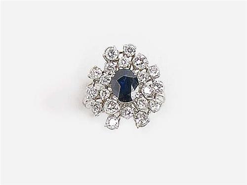 18 K white gold, 1 oval claw set real sapphire circa 1.0 ct and 20 different size brilliants circa 1.30 ct (MCrSi-P1) in asymmetrical form, import mark, weight: 6.6 g, diameter: 16.3 mm, in good condition.