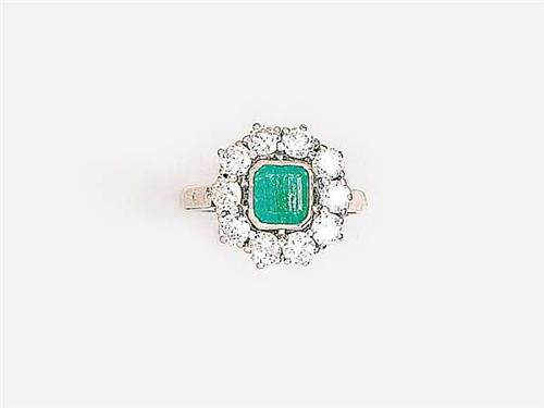 14 K white gold, 1 angular cut emerald circa 0.60 ct and 10 claw set brilliants circa 1.40 ct (FMCrP1) round in cluster, weight: 5.1 g, diameter: 17.5 mm.