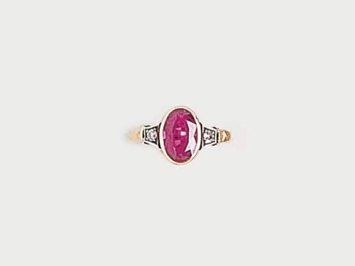 14 K gold, synthetic ruby and 2 brilliants circa 0.10 ct (R2CrP1), circa 1930, worn out mark, weight 4.7 g, diameter: 18.3 mm.