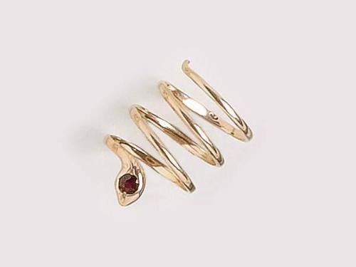14 K gold, twisted snake form, in the head there is 1 garnet decoration, circa 1930, marked, weight 4.2 g, diameter: 18.0 mm.