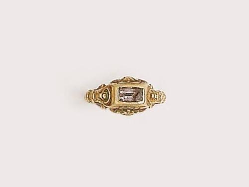 18 K gold, angular form head with 1 closed set mountain crystal, the rest of multicolour enamel, late 19th century, weight 7.9 g, diameter: 18.2 mm, broken stone.