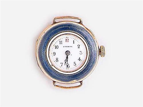 14 K gold, round case with fixed ears opening with hinge on the backside, blue-white enamel decoration, enamelled face with Arabic numerals, marked Eterna, circa 1910, import mark, case number: 1763670, gross weight: 13.3 g, damaged enamel.