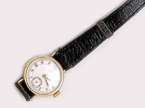 14 K gold, case with hinged back cover, metal face with Arabic numerals and subsidiary seconds, lever watch with 15 jewels in working condition, marked Omega, Switzerland, circa 1910, leather strap, case number: 187324, movement number: 8793429, gross wei