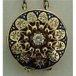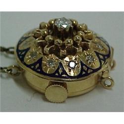 Lady's custom made 14K gold pendant watch with approximately 18 point center diamond surrounded by eleven 1 point single cut diamonds and cobalt blue enameling, mother of pearl face, Geneva 17 jewel movement, 20" chain is gold filled with enameled sections, chain has been altered Estimate 140/200
