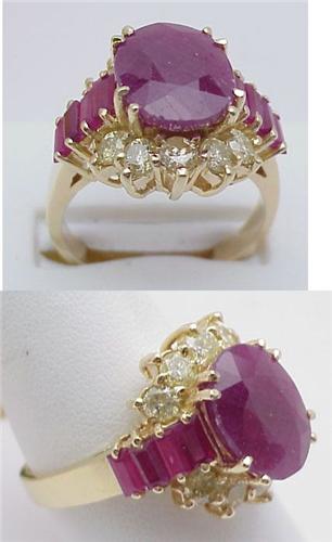 Lady's ruby ring with oval ruby center stone 13x10mm, baguette rubies 4.29Ctw and yellow diamonds .72Ctw 14kt yellow gold 10.6gr size 10
