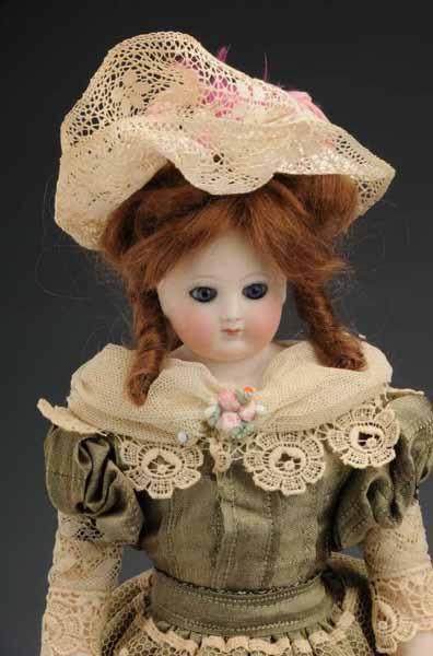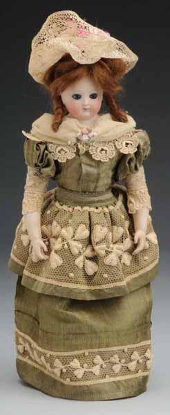 Description Germany, Ca. 1880. Unmarked bisque shoulder head, inset glass eyes, closed mouth, vintage mohair wig. Sturdy kid fashion-type body with bisque lower arms. Redressed in green satin and lace. Condition (Excellent).