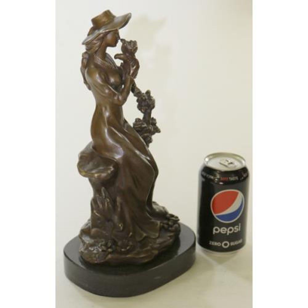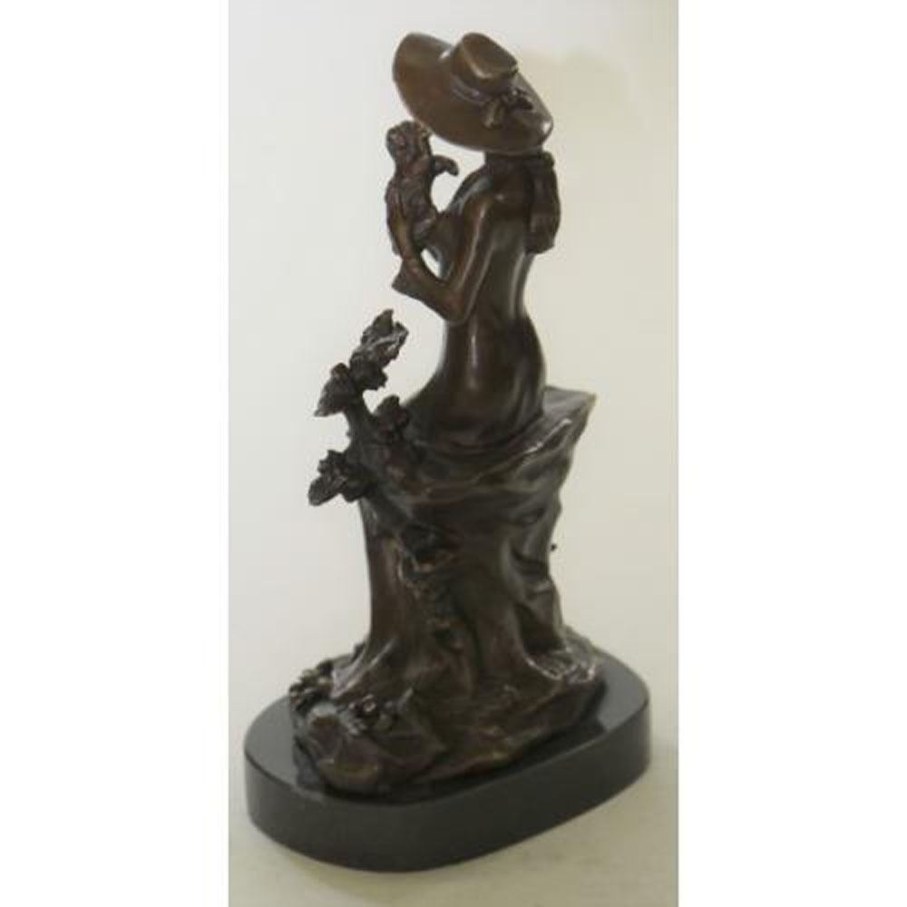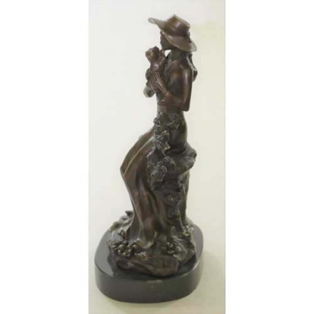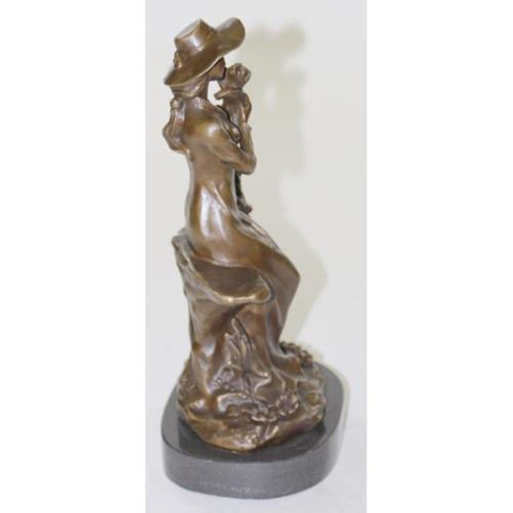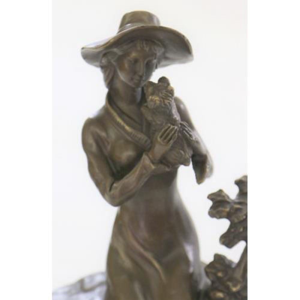 This is a wonderful statue of a Victorian woman with her dog. The woman is middle aged and fancily dressed. She is wearing a long beautifully detailed dress that hangs from her shoulders and has a broach under her bosom. Around her waist her dress is gathered giving her form more curves, each crease detailed with a pattern. On her thigh is a clip that again holds up the fabric of her dress, revealing her slender leg and bare feet. She sitting on a chair holding her faithful dog tightly. Her eyes are closed and she has the look of relaxation. This Handmade sculpture is created using the Lost Wax Method and made of solid 100% bronze with a two tone brown patina. Bronze Dimensions with Marble Base: Height 13 X Width 7 Inches. Weight: 10 LBS.