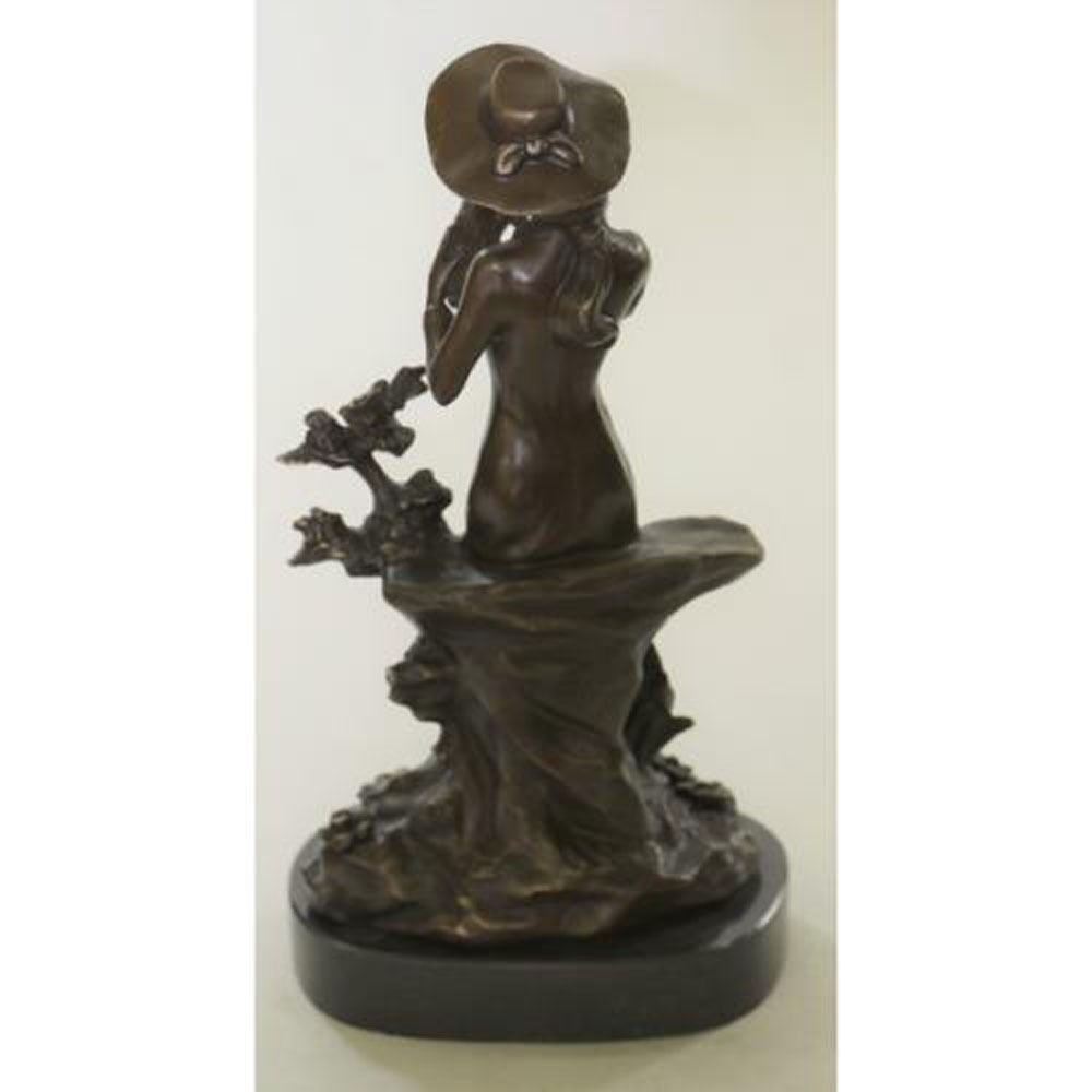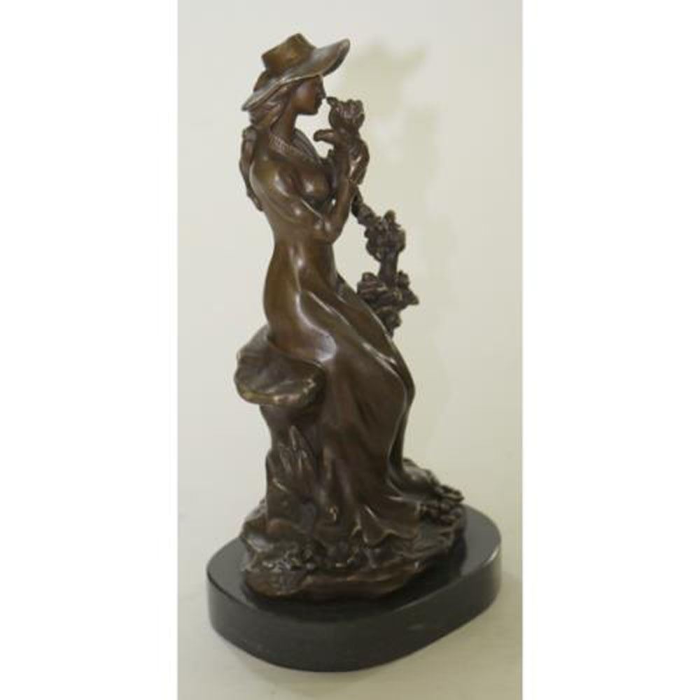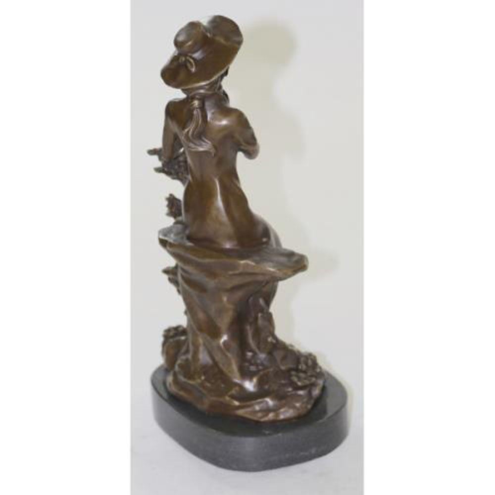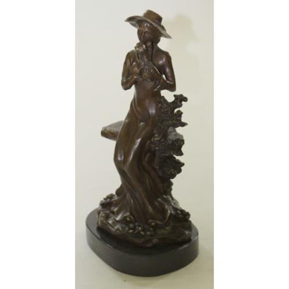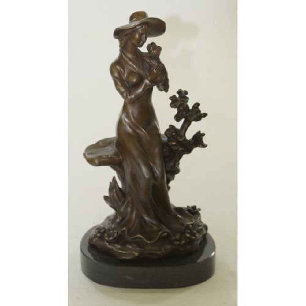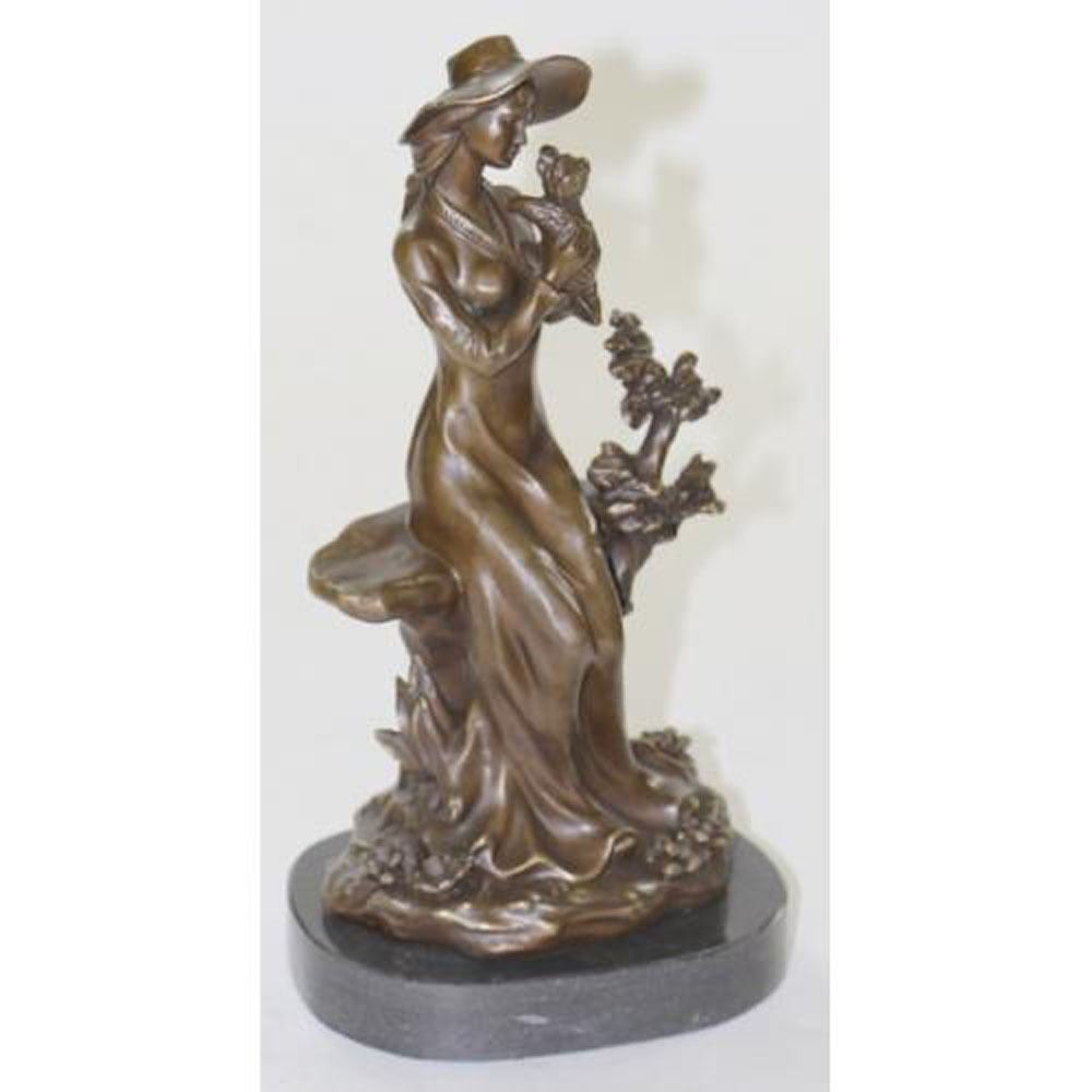 This is a wonderful statue of a Victorian woman with her dog. The woman is middle aged and fancily dressed. She is wearing a long beautifully detailed dress that hangs from her shoulders and has a broach under her bosom. Around her waist her dress is gathered giving her form more curves, each crease detailed with a pattern. On her thigh is a clip that again holds up the fabric of her dress, revealing her slender leg and bare feet. She sitting on a chair holding her faithful dog tightly. Her eyes are closed and she has the look of relaxation. This Handmade sculpture is created using the Lost Wax Method and made of solid 100% bronze with a two tone brown patina. Bronze Dimensions with Marble Base: Height 13 X Width 7 Inches. Weight: 10 LBS.