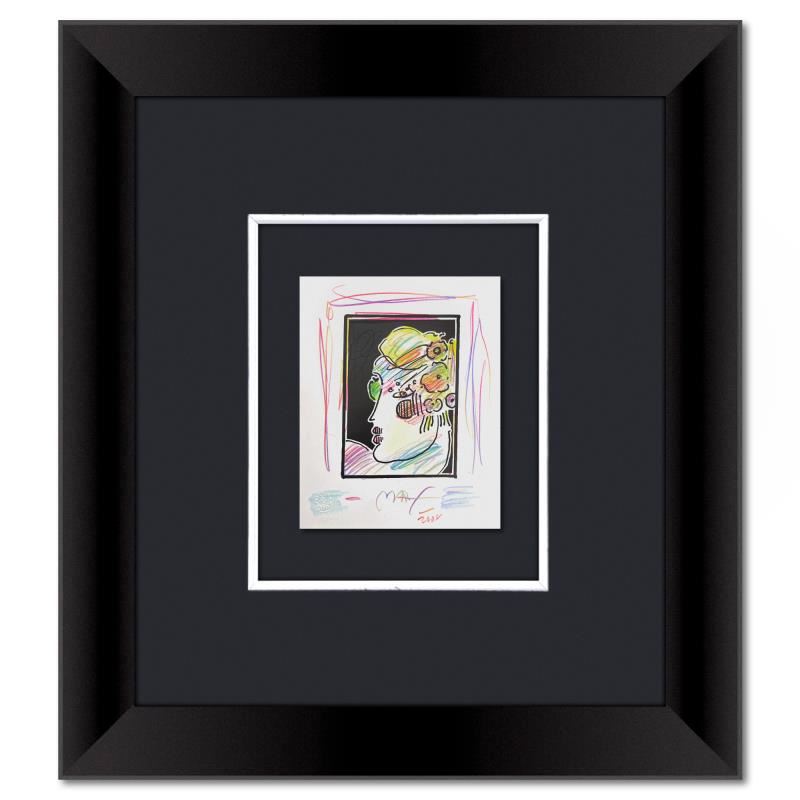 "Lady with Profile and Flowers III" is a one-of-a-kind mixed media on paper, hand signed by Peter Max. The piece comes custom framed with a backside cutout to display Peter Max Studio registration number 340274 certifying authenticity. Measures approximately 23" x 21" (frame), 9" x 7" (image). This item requires special handling and may have a longer than usual turnaround.