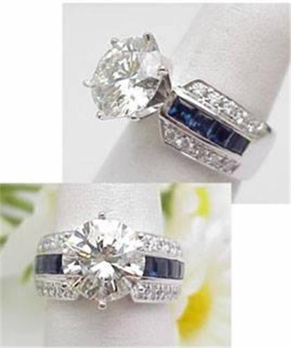Lady's 14kt white gold ring with a 4.02Ct Round brilliant cut center stone Clarity SI 2, Color J EGL Cert. With sapphires and diamonds