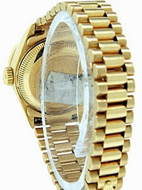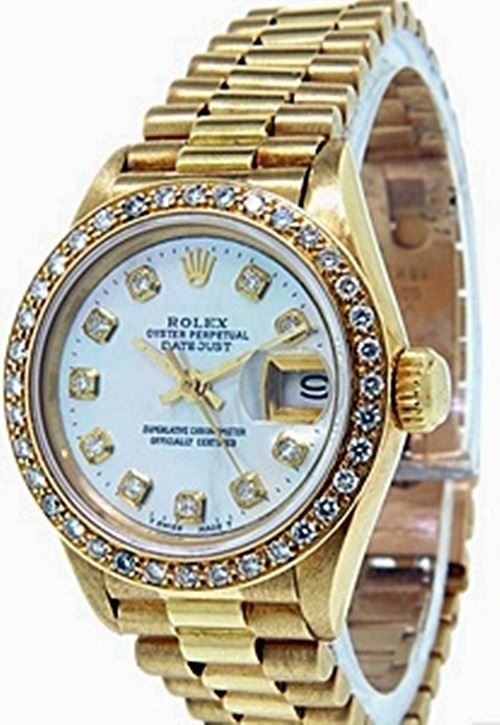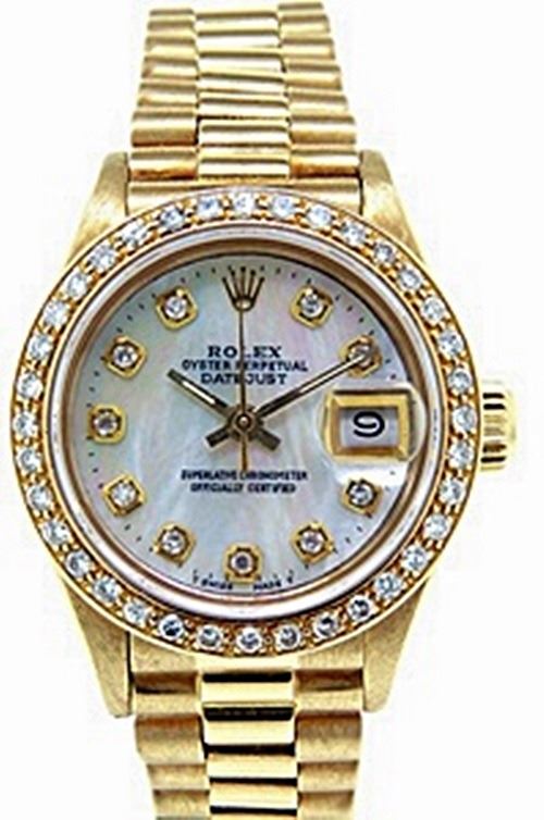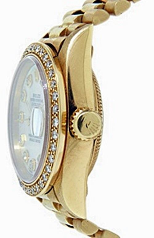 Manufacturer: Rolex , Model Name: President , Gender: Women's , Circa: 1984 , Condition: Pre-Owned, Great Overall Condition. Polished and Overhauled (Full Service) , Case: 18K Yellow Gold, 28mm Width (Including Crown) , Movement: Automatic , Dial: Custom Refinshed Facewith Applied Motherof Pearl and added Genuine Diamond Markers , Bezel: Aftermarket 18K Yellow Gold with Diamonds all around , Crown: 18K Yellow Gold , Bracelet/Strap: Presidential 18K Yellow Gold, Fits up to 6 1/2 Inches (16.3cm) Crystal: Sapphire , Calander: Quick-Set Date at Three o'clock , Box/Papers: NOT AVAILABLE Inv. Ref#107832