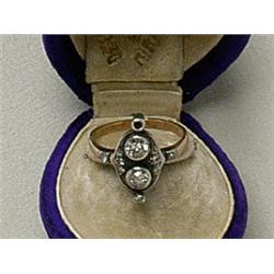 14 K gold and silver, pierced longish head with 2 bigger and 7 tiny brilliants circa 0.55 ct (R2CrS), circa 1930, worn out mark, diameter: 16 mm, weight: 3.1 g, 1 stone is missing.