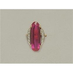 14 K gold, big oval form synthetic ruby flanked by 10 brilliants circa 0.40 ct (R2CrSi), circa 1940, unmarked, diameter: 17 mm, weight: 9.1 g, worn stone.