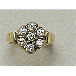 14 K gold, 7 claw set brilliants circa 1.0 ct (MCrSi-P1) in rosette form, modern, diameter: 18 mm, weight: 6.7 g, altered.