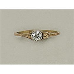 14 K gold, 1 button set brilliant circa 0.25 ct (R2CrP1), ring shoulder engraved by hand, circa 1940, marked, diameter: 19 mm, weight: 1.8 g, in good condition.