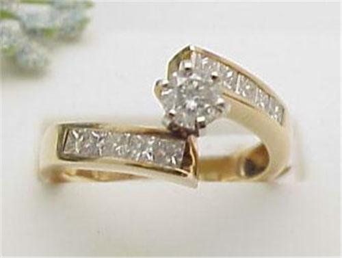 Lady's diamond ring by pass style with channel set princess cut diamonds .55Ctw and a round center stone .37Ct 14kt yellow gold 5.5gr size 6.5