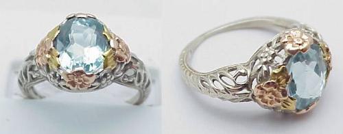 Lady's ring aquamarine in a filigree floral design 14kt white, rose and yellow gold 2.8gr size 4.75