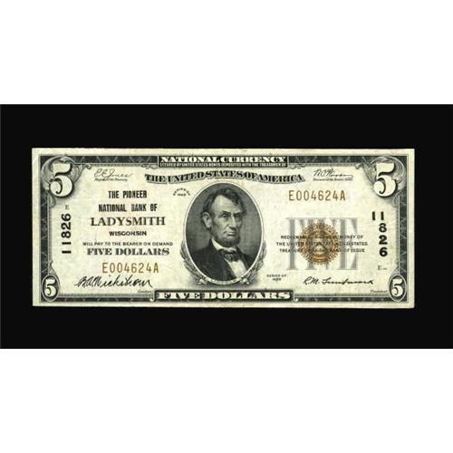 <B>Ladysmith, WI</B></I> - $5 1929 Ty. 1 <B>The Pioneer NB</B></I> Ch. # 11826<BR> Fives only from this bank in both large and small size, with this example considerably superior to most that we've seen. Pleasing <B>Very Fine, </B></I>a nice note bearing an interesting and sought after town name. <BR><BR><b>Shipping:</b> Coins & Currency (<a target="_blank" href="http://www.heritageauctions.com/common/shipping.php">view shipping information</a>)
