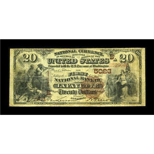 <B>Lafayette, LA</B></I> - $20 1882 Brown Back Fr. 501 <B>The First NB</B></I> Ch. # (S)5023<BR>This <B>Fine</B></I> example is the only $20 Brown Back documented from here. It enjoys ample margins all around and retains considerable eye appeal for the grade.<BR><BR><b>Shipping:</b> Coin/Currency (<a target="_blank" href="http://www.heritageauctions.com/common/shipping.php">view shipping information</a>)