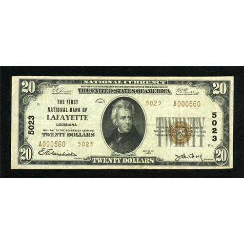 <B>Lafayette, LA</B></I> - $20 1929 Ty. 2 <B>The First NB</B></I> Ch. # 5023<BR> Last appearing in our 2006 Long Beach sale, where we described, "From Bayou country comes this utterly problem-free <B>Very Fine</B></I> note located in the parish of the same name." According to the latest Track & Price, this is one of only two Type Two $20's.<BR><BR><b>Shipping:</b> Coins & Currency (<a target="_blank" href="http://www.heritageauctions.com/common/shipping.php">view shipping information</a>)