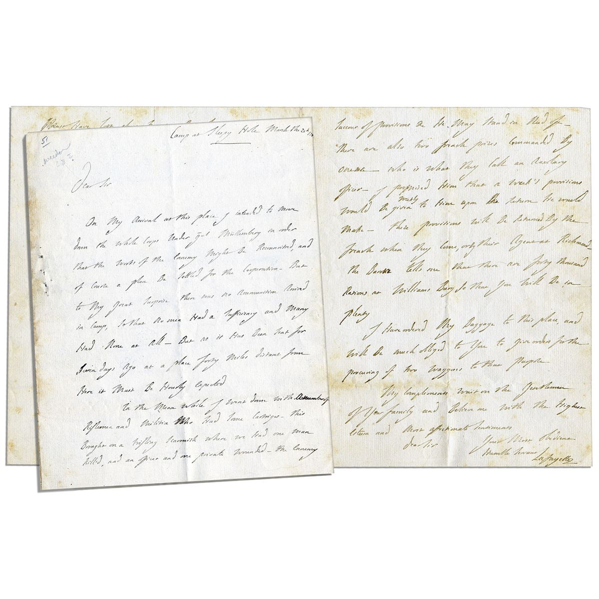 Marquis de Lafayette letter signed ''Lafayette M G [Major General]''. Dated 20 March 1781, from ''Camp at Sleepy Hole,'' Lafayette writes at the beginning of his Virginia Campaign when he found his 1,200 light infantry troops ill-prepared to fight against British and Hessian soldiers. Addressed in Lafayette's hand to General George Weedon, letter reads in part: ''...On my arrival at this place I intended to move down the whole corps under Gnl Mullemberg in order that the works of the enemy might be reconnoitered...but to my great surprise there was no ammunition arrived in camp, so that no men had a sufficiency and many had none at all...for want of ammunition we could not drive [the British] into town...I have ordered my baggage to this place, and will be much obliged to you to give orders for the procuring of two waggons [sic] to that purpose...'' Lafayette began serving in the American Revolution assisting George Washington. Initially an American major general in name only, he was eventually placed in command of actual divisions and proved an outstanding commander. His Virginia Campaign was an early component of the Siege of Yorktown, which was critical to the American victory. Letter runs three pages and measures 6.5'' x 8''. Foxing to center fold; very good condition. Published in ''Lafayette in the Age of the American Revolution,'' III:406-7.