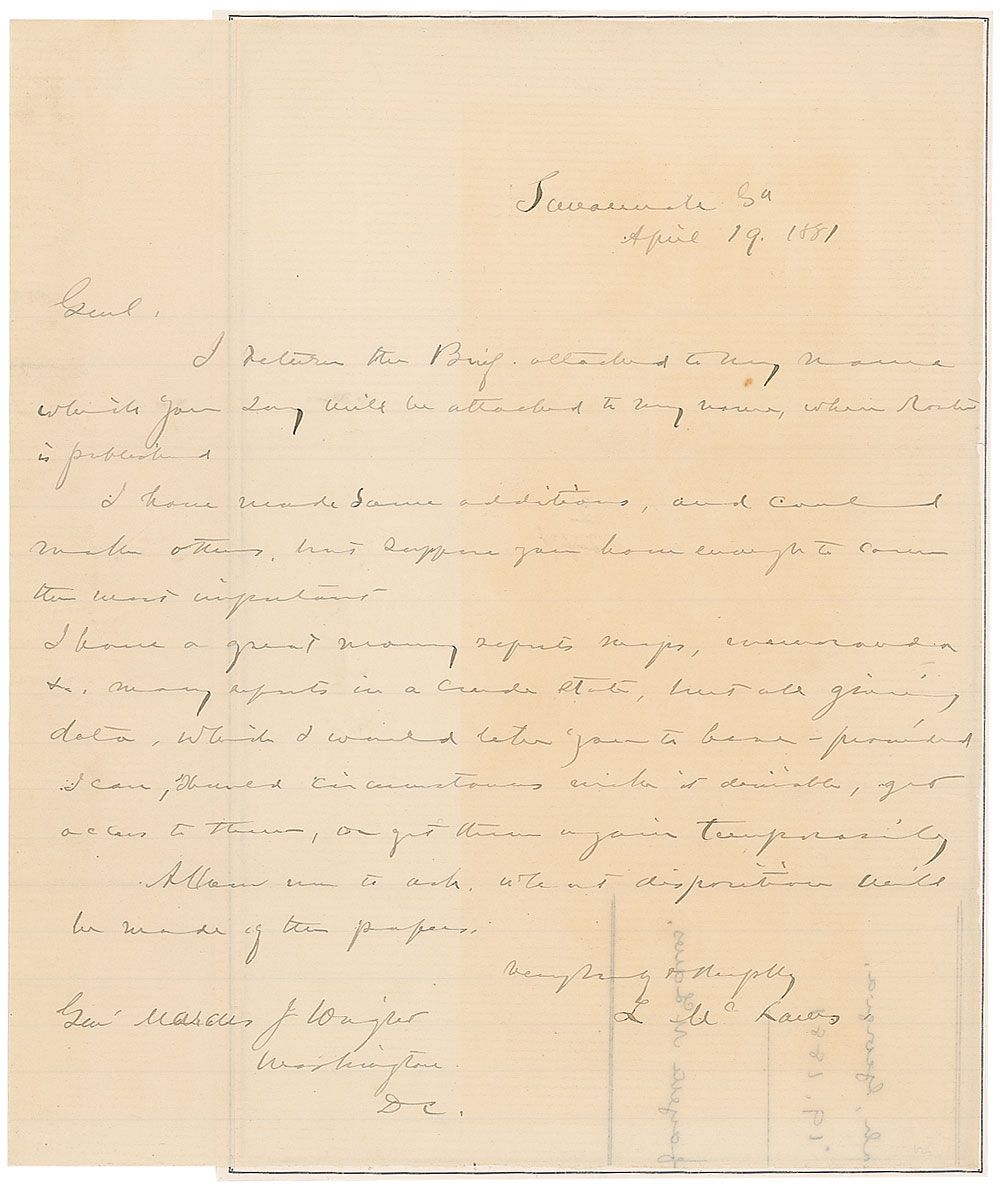 Confederate general (1821–1897) praised by General Lee for his service early in the war, but later court-martialed for inefficiency by James Longstreet. ALS signed “L. McLaws,” one page, 8 x 9.5, April 19, 1881. Letter to General Marcus Wright. In part: “I have made some additions, and could make others, but suppose you have enough to cover the most important. I have a great many reports, maps, memoranda…I can, should circumstances make it desirable, get access to them, or get them again temporarily.” A mild block of toning to right side and show-through from mounting remnants to reverse, otherwise fine condition.