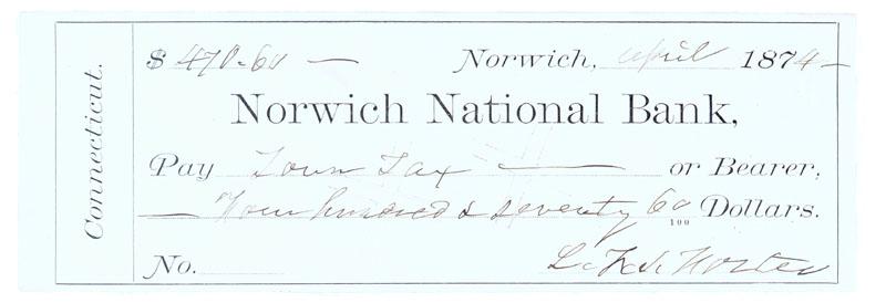 Norwich National Bank Check Signed by LAFAYETTE S. FOSTER (1806-1880) American politician and lawyer. Foster served in the U.S. Senate and on the Connecticut Supreme Court. April, 1874. 8” x 2 3/4” Norwich. April 1874. Punch cancelled