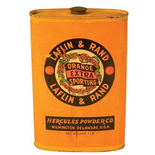 Laflin and Rand Orange Extra Sporting Gun Powder Tin, Hercules Powder Co. Wilmington, Delaware Original paper label, excellent condition. 4 X 6 1/2 X 1 inches.