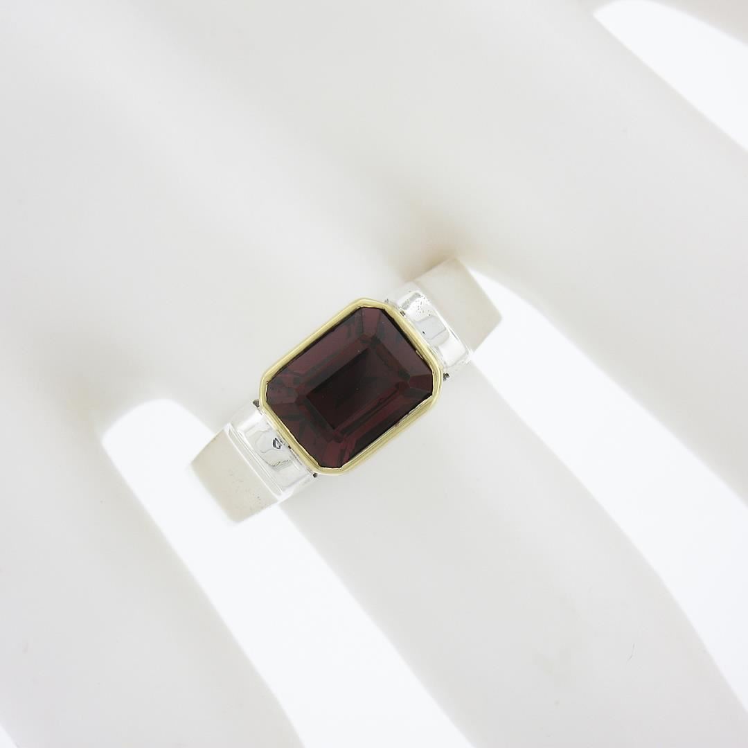 A solid 18k yellow gold & silver solitaire ring by Lagos Caviar, featuring 1 emerald cut natural rhodolite garnet (7.6x5.5mm). The ring is size 6.5, weighs a total of 5.70 grams, and measures 7.2mm wide.