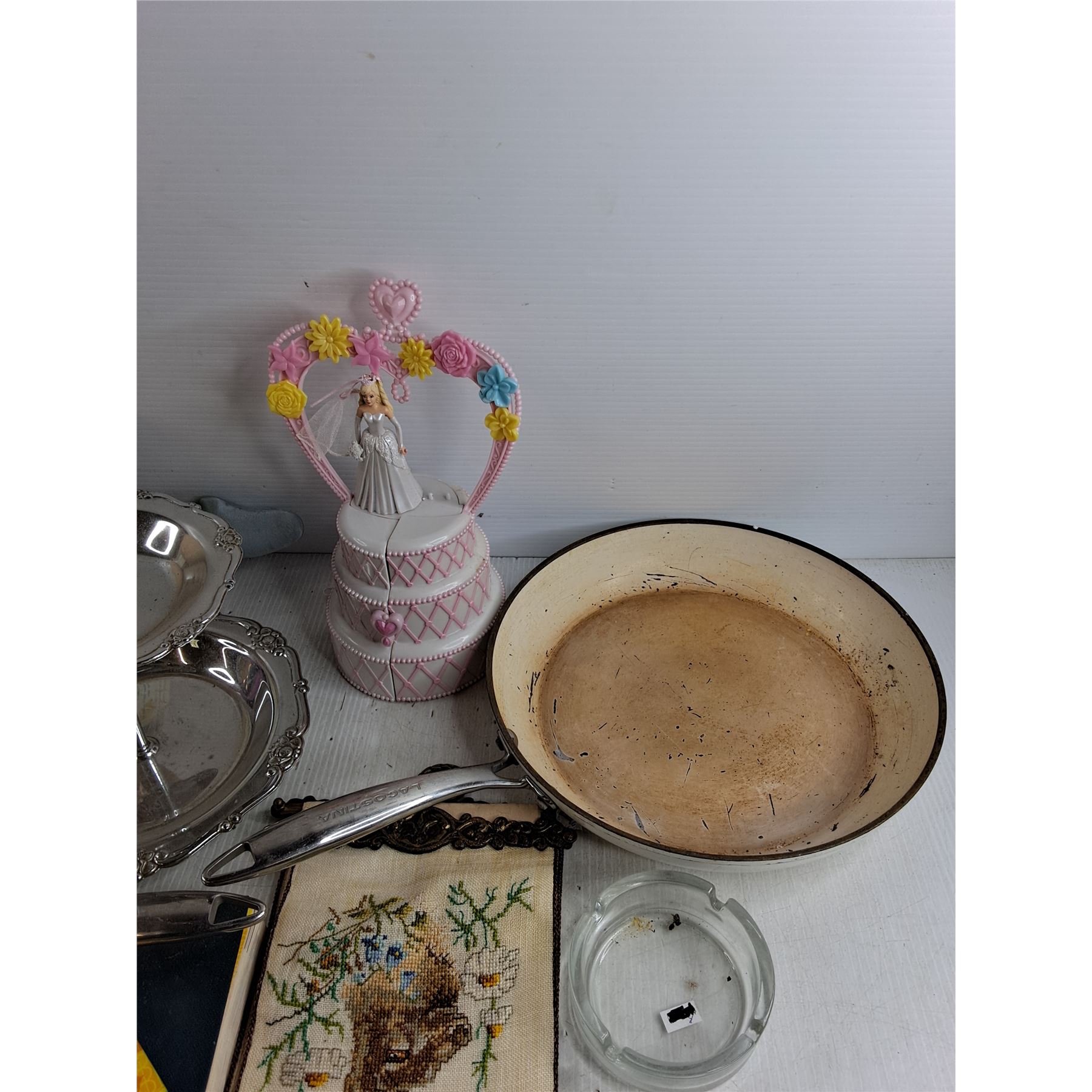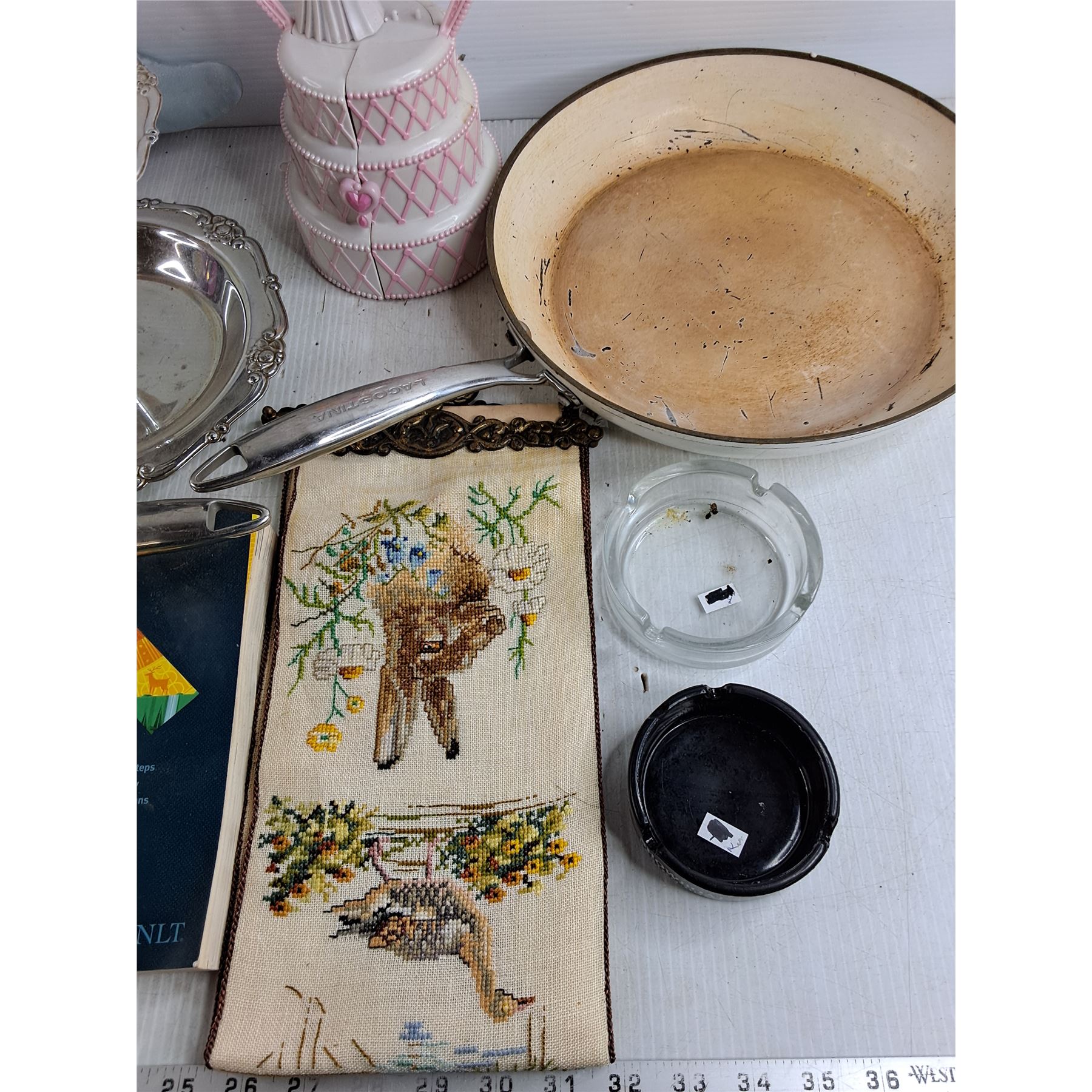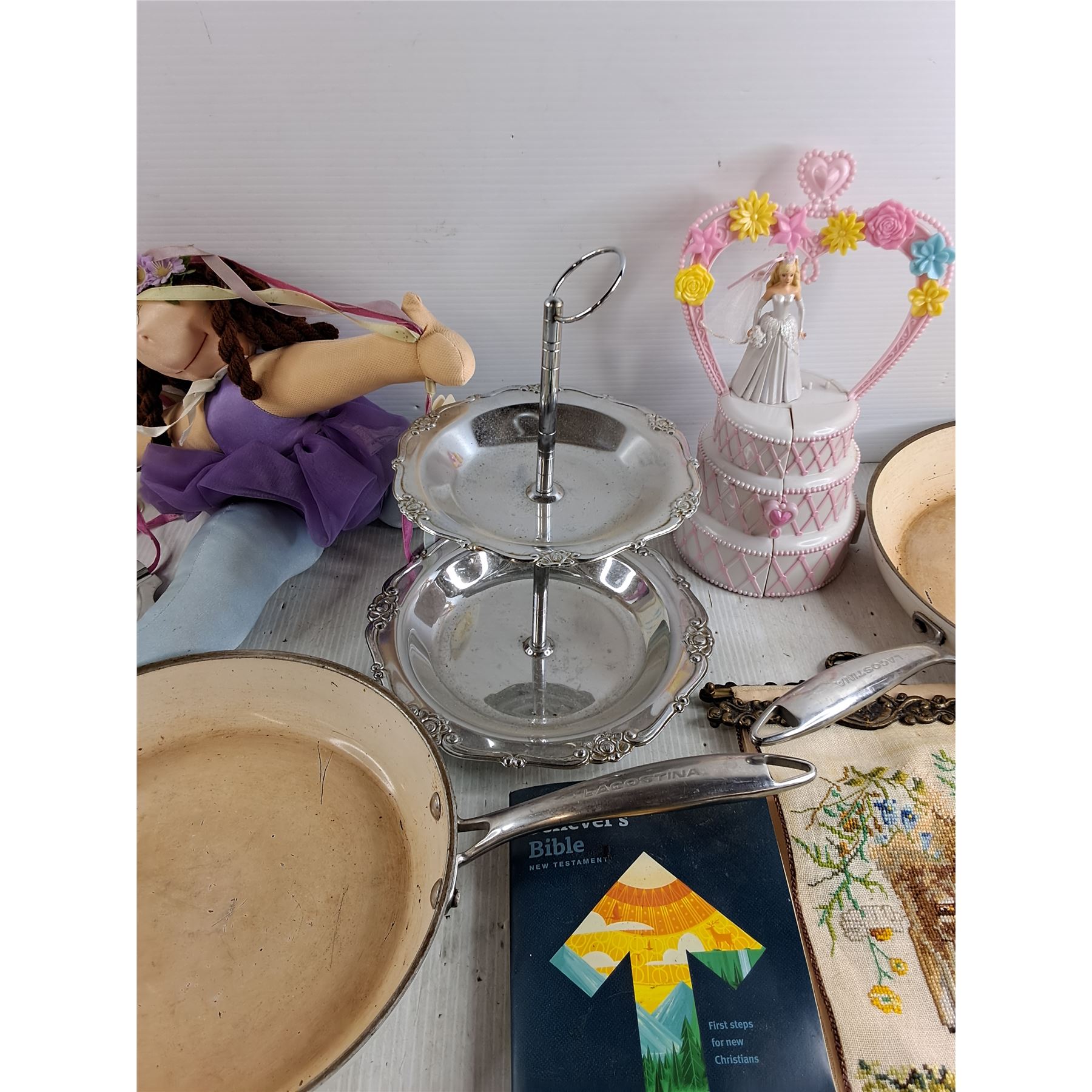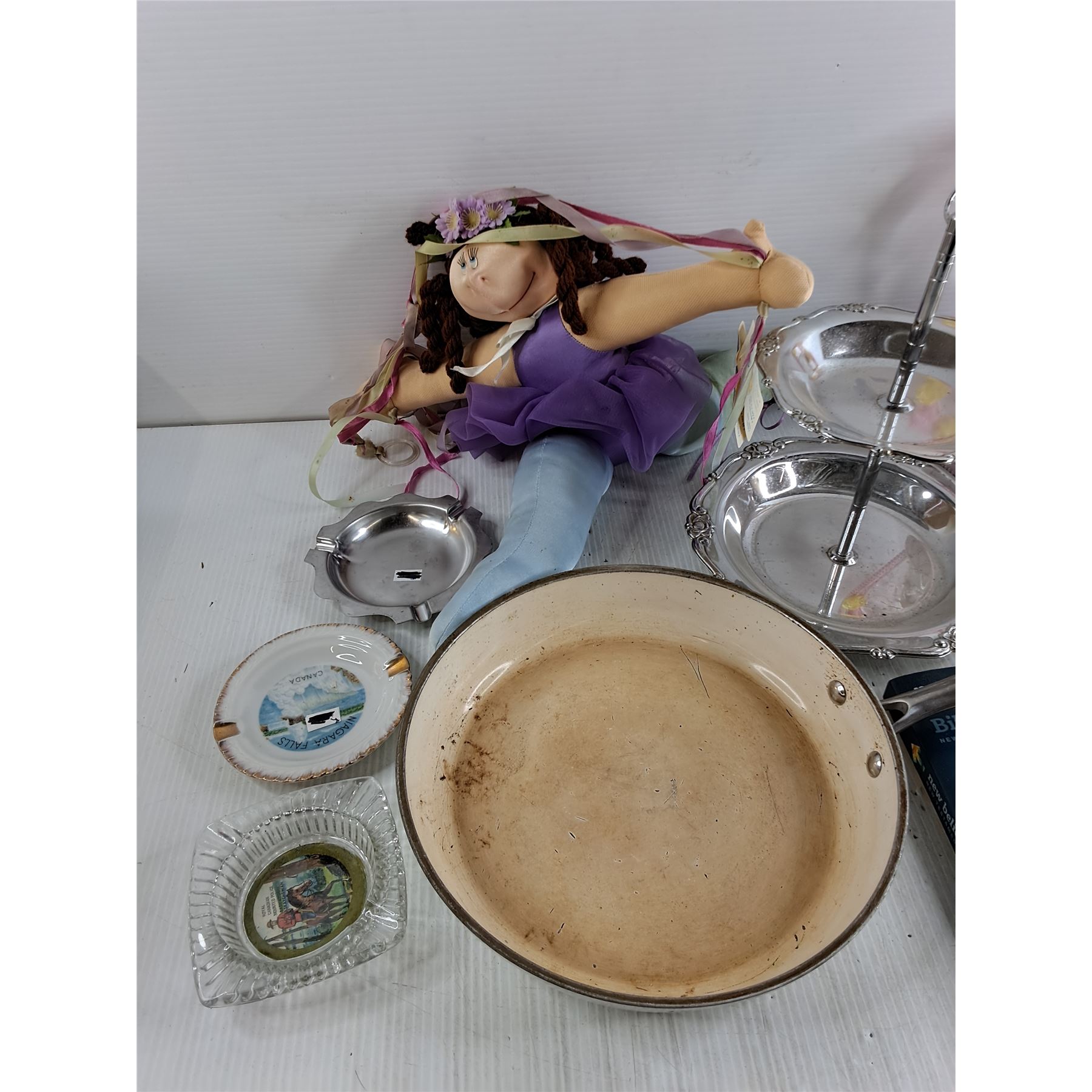 Lagostina Frying Pan, Ash Trays, Two Tiered Serving Tray, Cloth Doll, Misc