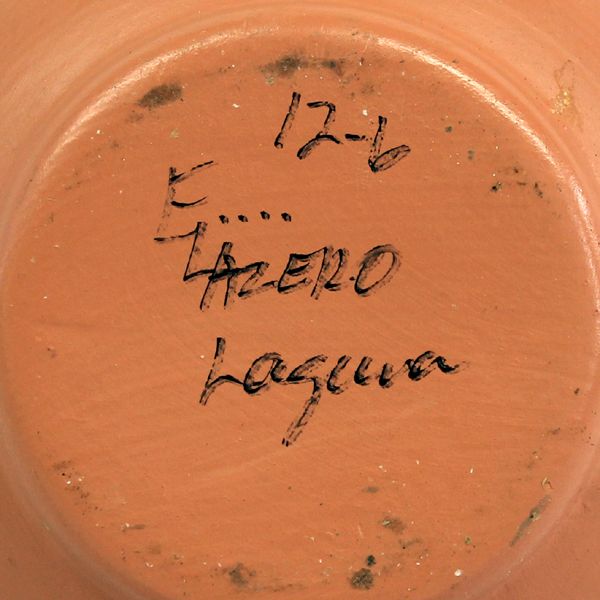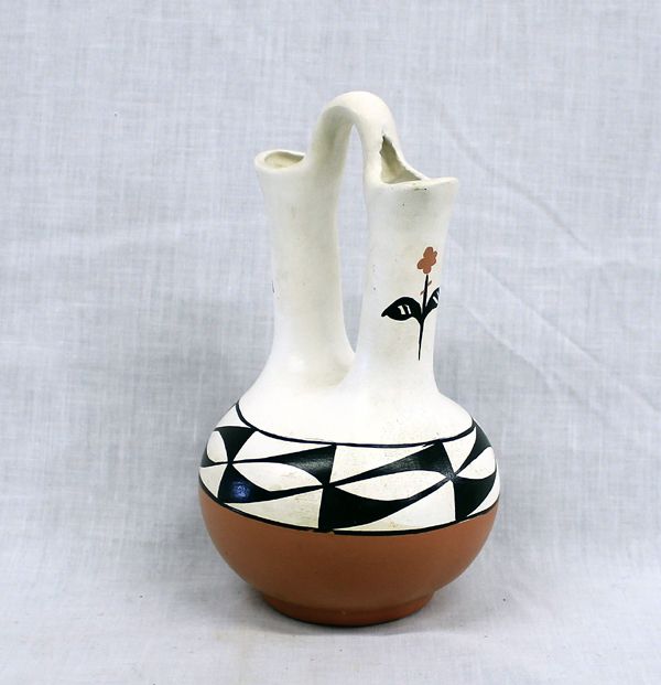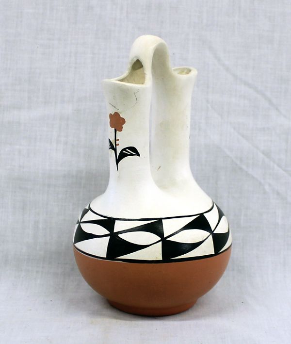 Laguna Acoma Wedding Vase by E. Lazero; features traditional Acoma Black and Rust designs on white, measures 4.25''W x 7''H