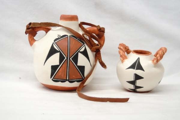 Native American Laguna Double Handled Jar by A.M. Arnett (measures 3'' x 3'') and Acoma Pottery Canteen (measures 5'' x 5'') and has leather handle