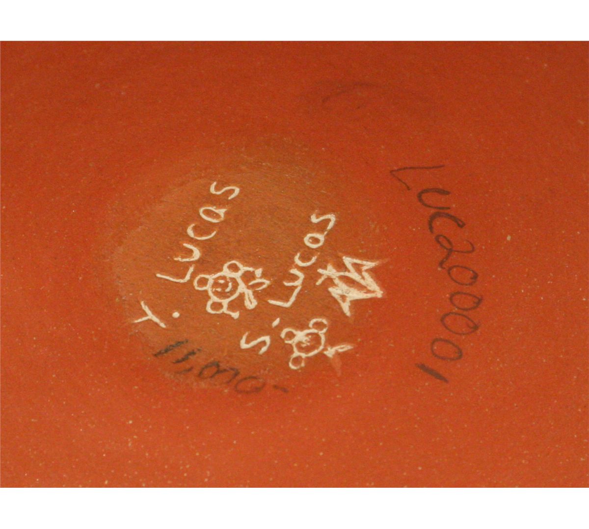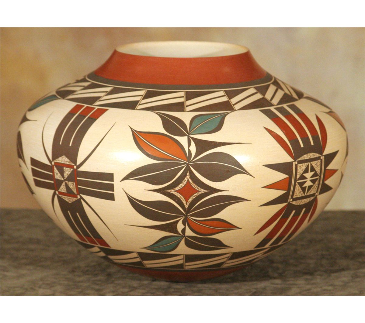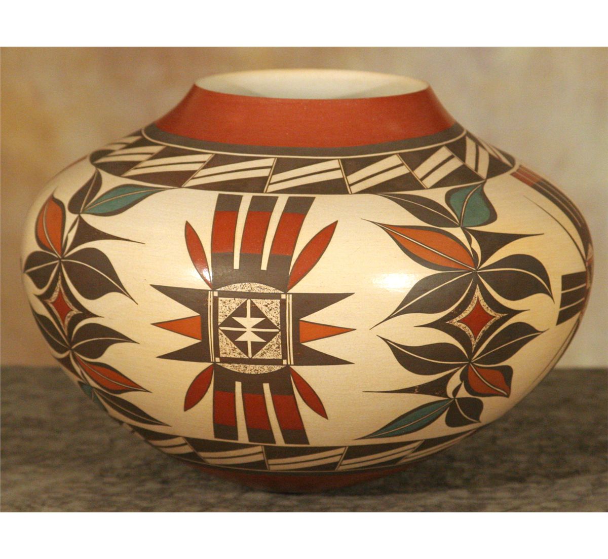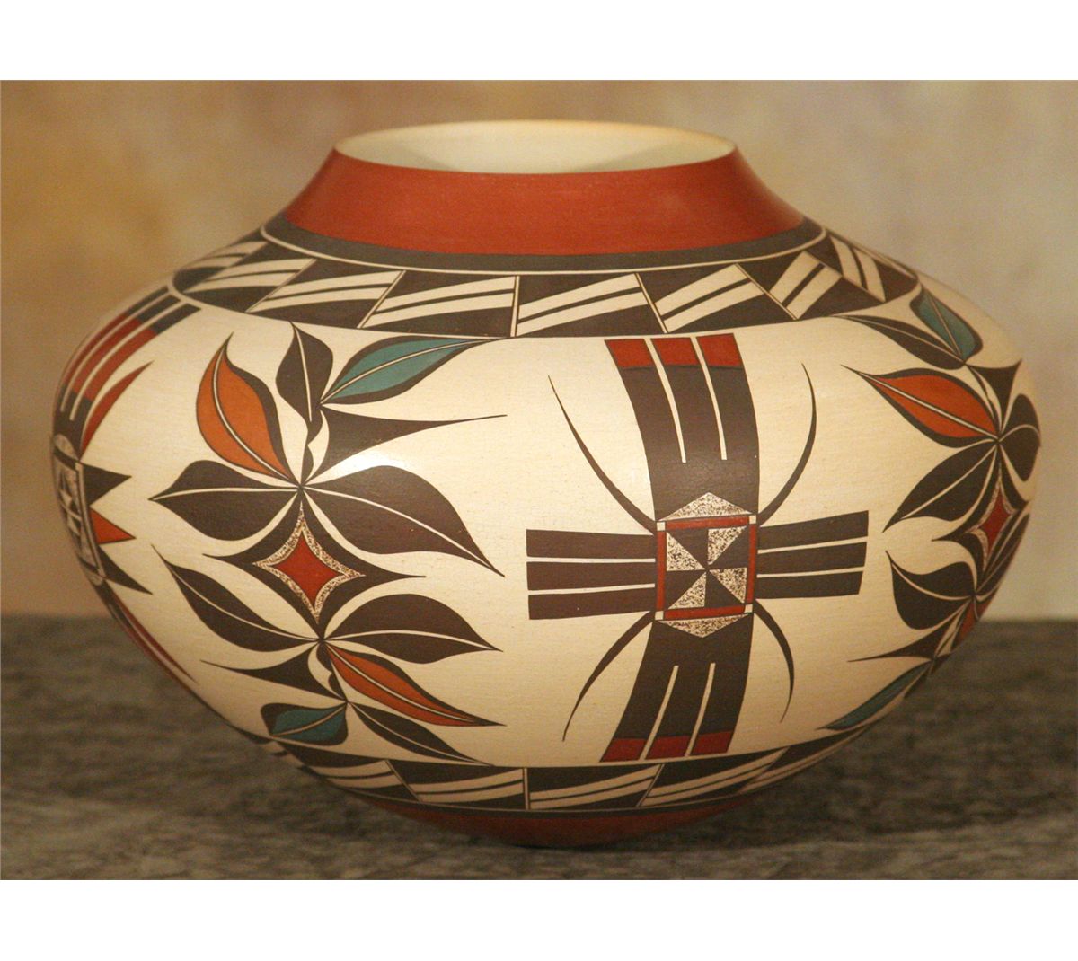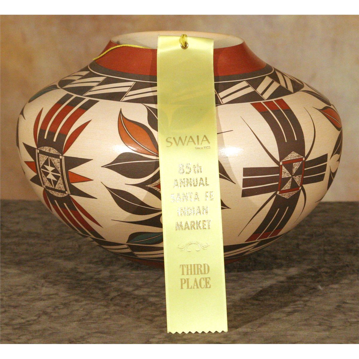 Laguna Jar by Steve and Yvonne Lucas. 12" x 9". Polychrome geometric and floral designs. SWAIA award winner in 2006 (ribbon included). Inscribed: Y. LUCAS S. LUCAS with cyphers.