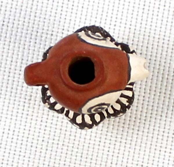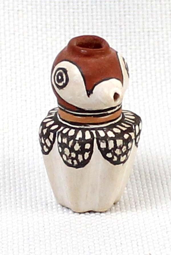 Laguna Miniature Owl Effigy Pitcher by Thomas Natseway, measures .75'' x .5'' and is signed on the bottom, FYI: ''Thomas Natseway is one of the most renown miniaturists in Pueblo pottery. He was born on April 19, 1953 into the Laguna Pueblo. He was taught the fundamentals of constructing handmade pottery using the ancient traditional hand coiling method by his relatives and his wife, Charmae from the Acoma Pueblo.''