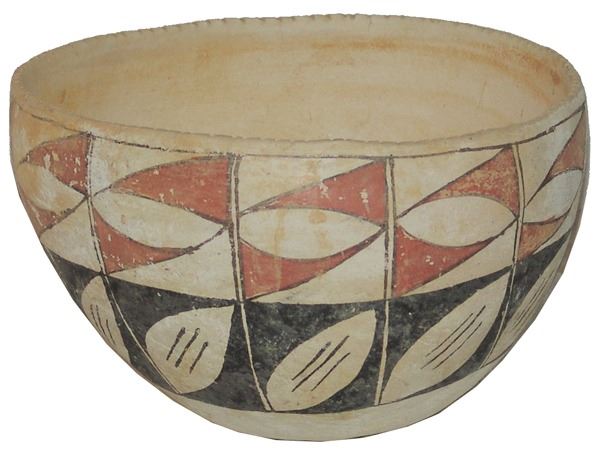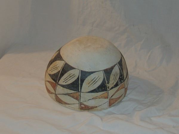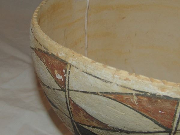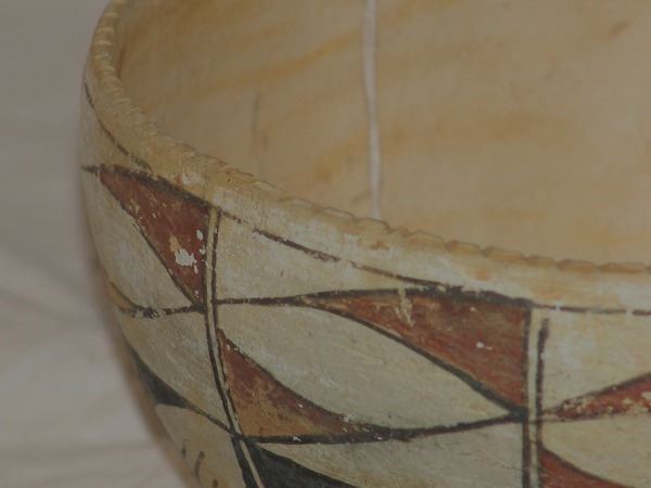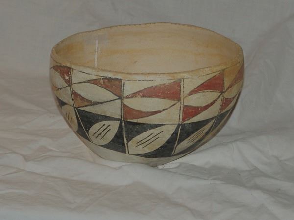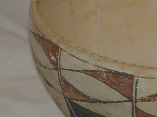 Early/Mid 1900s 5-1/2" x 9" Unique, earlier, thin walled polychrome pottery bowl with traditional panel motif and rare, ticked rim. Good condition, intact, has scuffs, etc. from use.