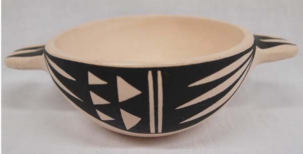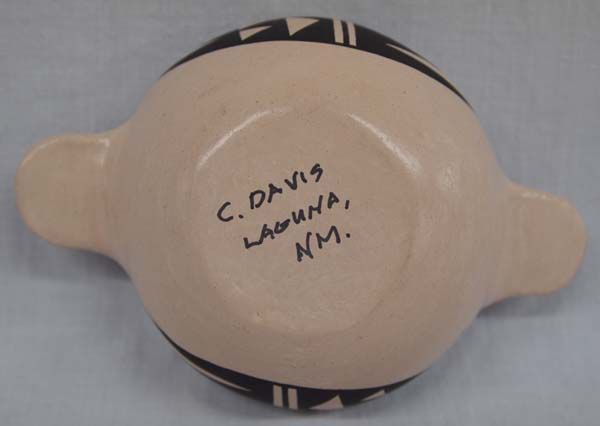 Laguna Pueblo Pottery Handled Bowl by C. Davis, measures 2''H x 6''W, signed on bottom by art, features black geometric lines and designs on buff base, double handled