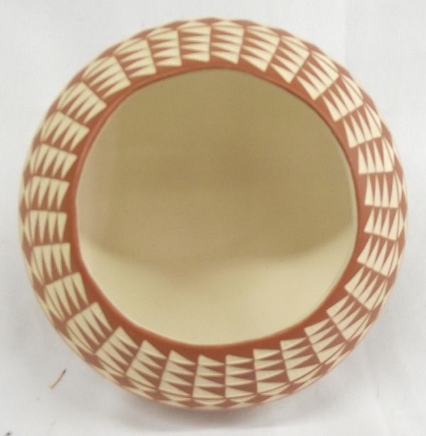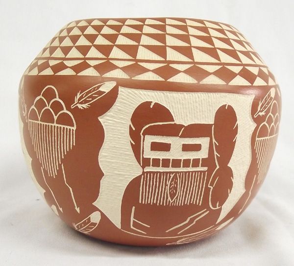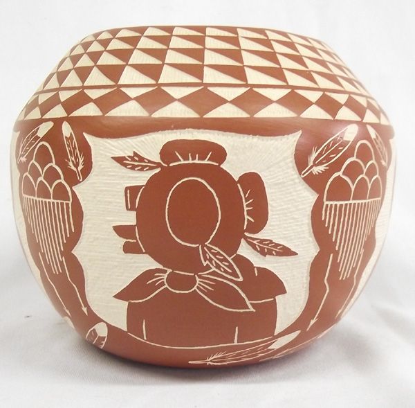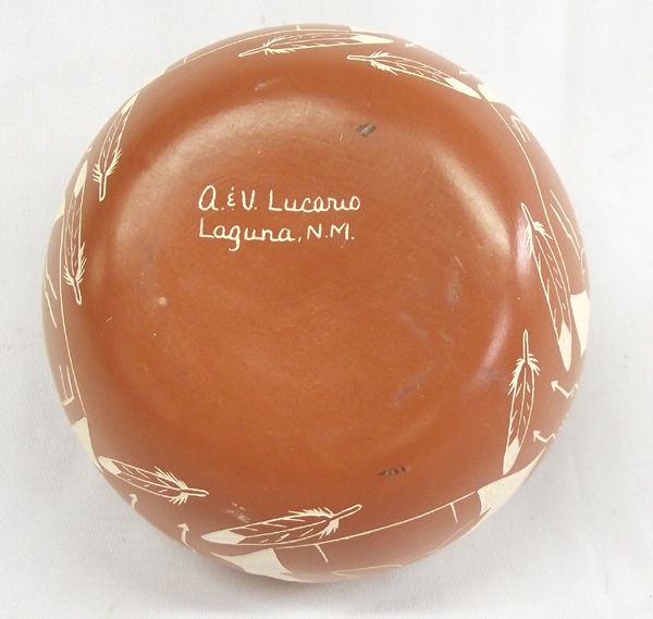 Laguna Sgrafitto Pottery Bowl A. & V. Lucario. This is a red and white Laguna bowl with sgrafitto (incised) designs that cut away the red glaze down to the white clay body. There are mirror images of kachinas on the bowl, separated by four designs of rainclouds. This lovely bowl measures 5''H x 6''W.