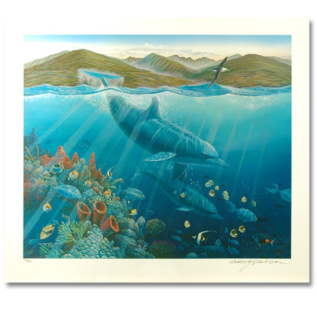 Lahaina Sea Flight by Robert Lynn Nelson is a limited edition mixed media on paper, numbered and hand signed by the artist! Includes Certificate of Authenticity! Measures approx. 31.5 x 27.5 (with border), 27.5 x 23 (image).