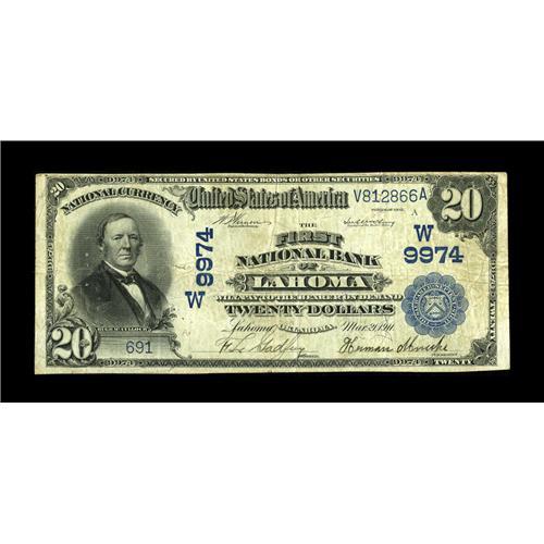 <B>Lahoma, OK</B></I> - $20 1902 Date Back Fr. 645 <B>The First NB</B></I> Ch. # (W)9974<BR>Large notes only from this bank, the sole issuer in this tiny Garfield County community. Pen signed <B>Fine+,</B></I> with a few pinholes that barely detract.<BR><BR><b>Shipping:</b> Coin/Currency (<a target="_blank" href="http://www.heritageauctions.com/common/shipping.php">view shipping information</a>)