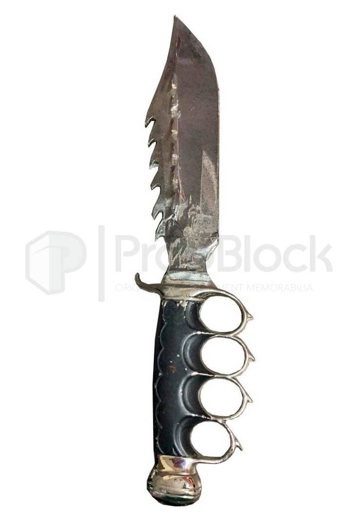 Stunt knife used in the production of the film Laid to Rest. A young girl wakes up in a casket with a head injury and no memory of her identity. She quickly realizes she was abducted by a serial killer and she must fight to survive. This is a stunt knife used in scenes where a sharp blade would not be apropriate to film with. This piece features a chromed blade and black handle with chromed finger holes. This piece remaisn in excelelnt, production used conditon.