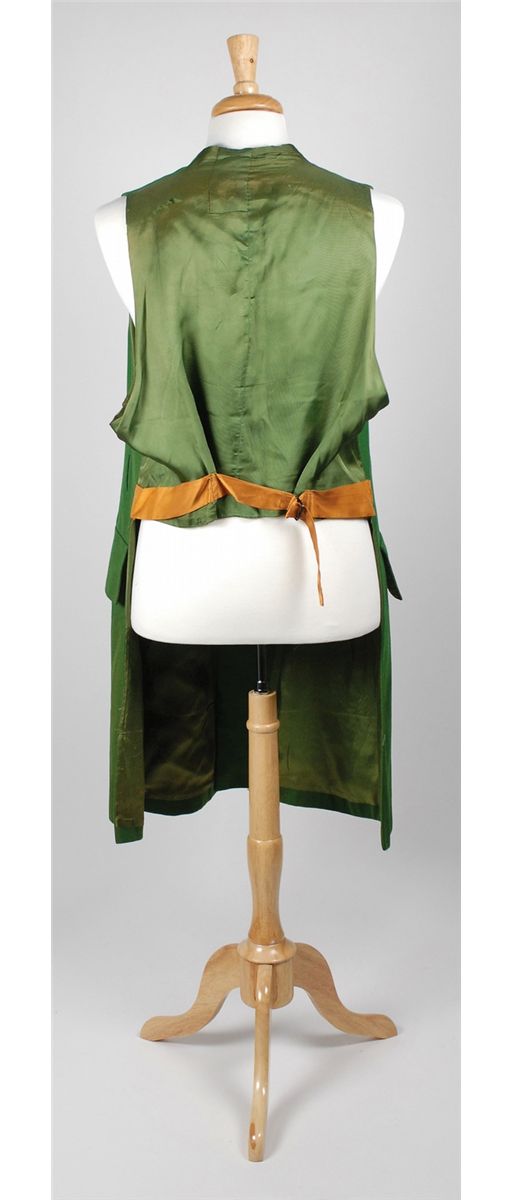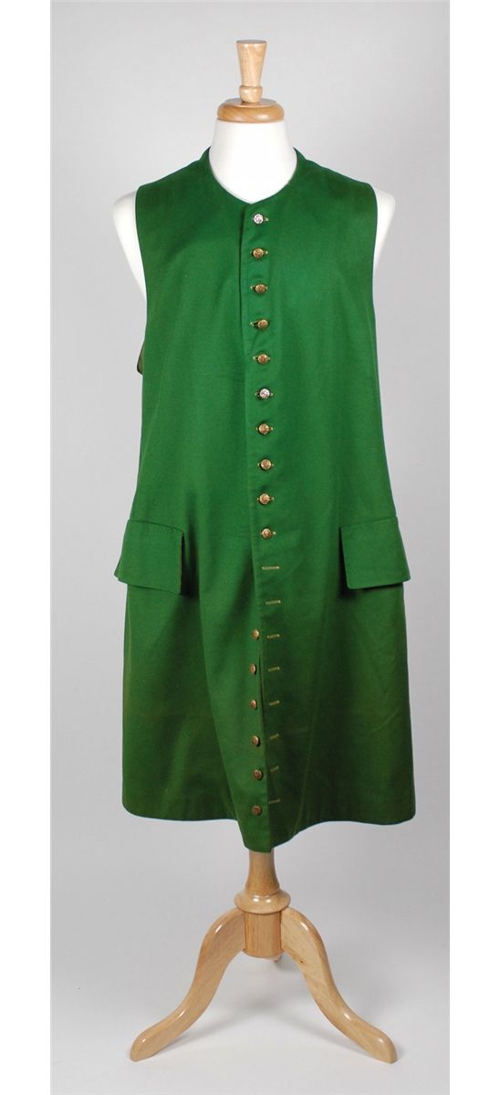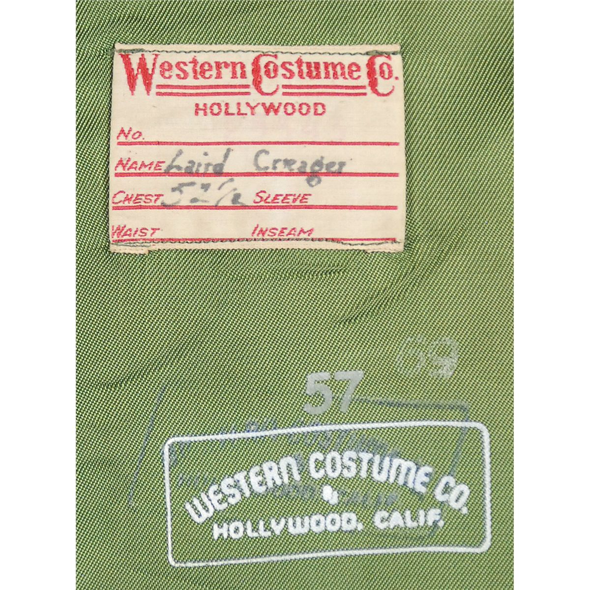 Actor (1913–1944) best remembered for the titular role in The Lodger. He died from a heart attack at age 31. Vest made for Laird Cregar for an unidentified film. Based upon the style and period of the garment, it is possibly production made the 1942 film The Black Swan. Very long green vest bears a single row of ornate buttons and a strap and buckle in the back, missing one half of the buckle. Inside of the lining bears a Western Costume Company tag, with Cregar’s name written on the second line, as well as his chest size, an impressive 52.5.? Lining also bears a Western stamp as well. In fine condition. Cregar only did 16 films and died young, at the age of 31.
