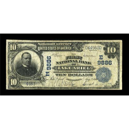 <B>Lake Ariel, PA</B></I> - $10 1902 Plain Back Fr. 627 <B>The First NB</B></I> Ch. # (E)9886<BR> A very scarce Northeastern Pennsylvania note, with the census showing just six large examples. This example is nicer than the last note from here we had to offer, which realized $977.50 one year ago. <B>About Fine.</B></I><BR><BR><b>Shipping:</b> Coins & Currency (<a target="_blank" href="http://www.heritageauctions.com/common/shipping.php">view shipping information</a>)