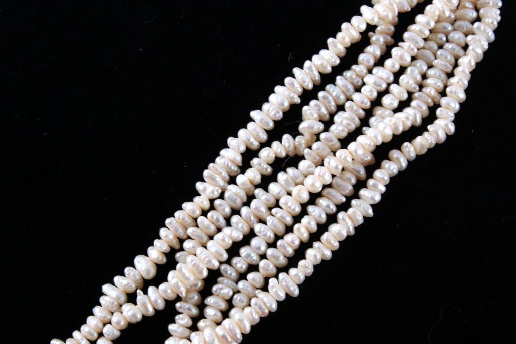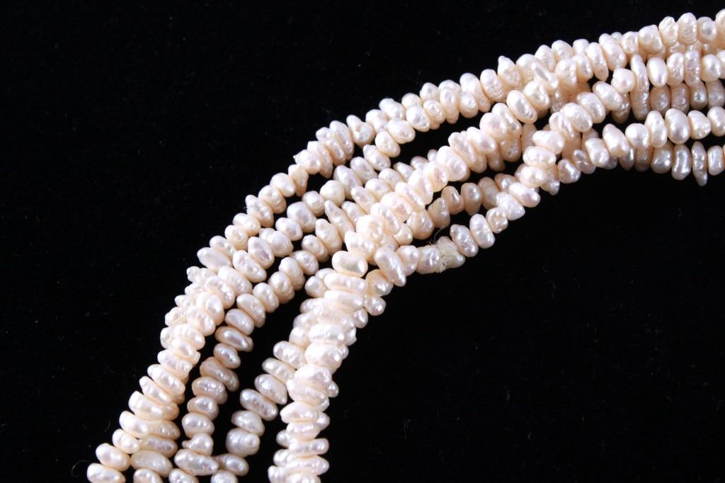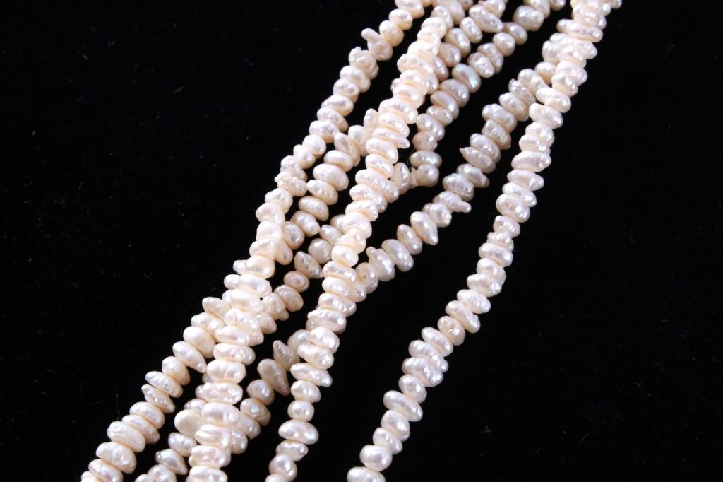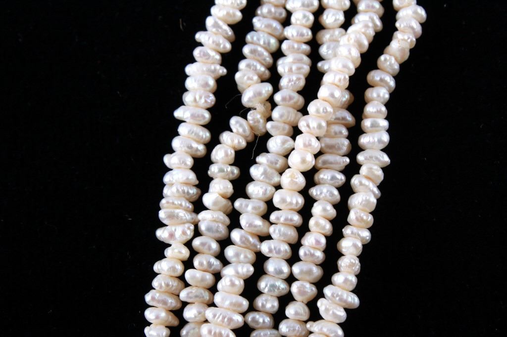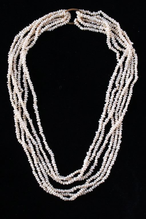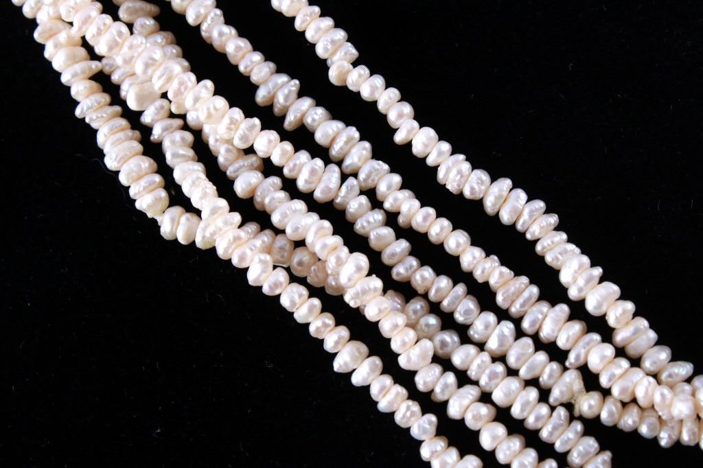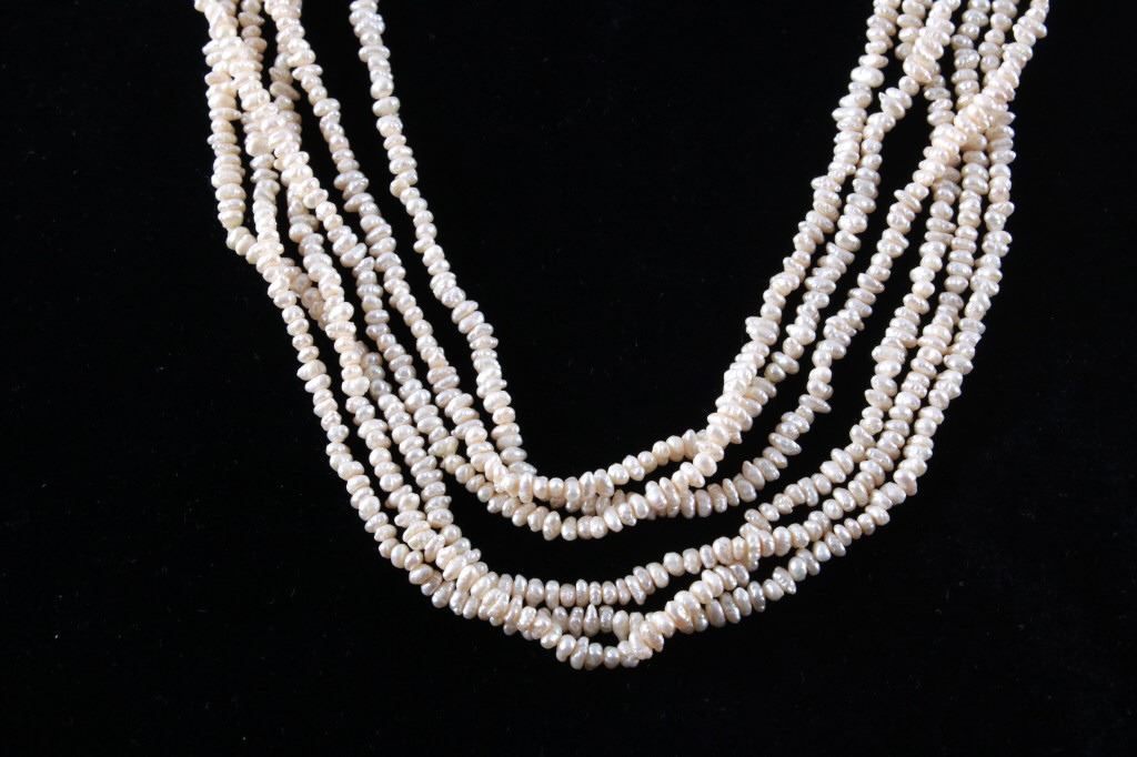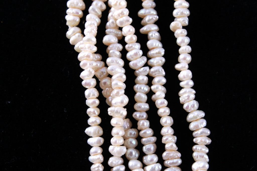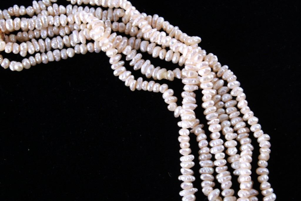 Featured in this lot is this Lake Biwa Japanese multi strand pearl necklace circa 1946-1949. There are three strands in this necklace with small Biwa pears strung on twine that shows coloration of cream to reflective pink and is clasp together with a 14k gold clasp. Biwa pearls refer to the pearls that came from Lake Biwa, Japan. These were the forerunners to today’s freshwater pearls and were so popular that, until recently, all freshwater pearls were called Biwas. Today, while Biwa pearl production has all but ceased, these pearls continue to be popular and sought after. Kokichi Mikimoto began to experiment in Lake Biwa with mussels instead of oysters and with mantle tissue irritants instead of beaded nuclei. A piece of mantle tissue was grafted into the mussel. The mussels could have multiple cultures of tissue grafted into them allowing the mussel to harvest multiple pearls with irregular light play and varying colors. The condition of this multi strand necklace is good with no obvious signs of damage and in good overall condition. The measurements of this necklace from tip to tip are 23".