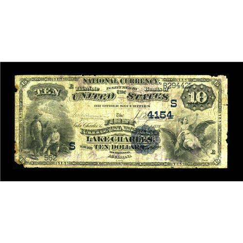 <B>Lake Charles, LA</B></I> - $10 1882 Date Back Fr. 539 <B>The First NB</B></I> Ch. # (S)4154<BR>This <B>Good-Very Good</B></I> note is an important discovery from here, being the first Second Charter Date Back of any denomination to surface from this issuer. There is some margin roughness and a few chinks out of the borders here and there, especially at lower left, but the design area is largely intact. A note whose scarcity more than compensates for any appearance problems it mat have.<BR><BR><b>Shipping:</b> Coin/Currency (<a target="_blank" href="http://www.heritageauctions.com/common/shipping.php">view shipping information</a>)